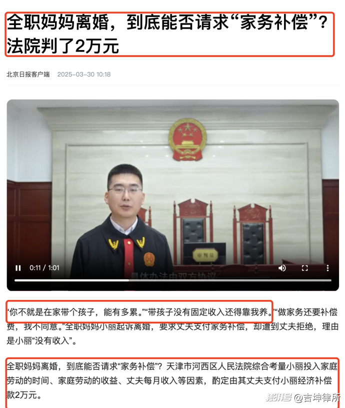 天津一位全職媽媽小麗,在起訴離婚時(shí)要求丈夫支付家務(wù)補(bǔ)償,卻被丈夫以"你沒收入"為由拒絕。最終法院判決:家務(wù)勞動(dòng)有價(jià)!丈夫需支付2萬(wàn)元補(bǔ)償。