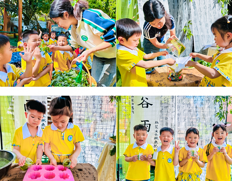 ?活動(dòng)伊始,老師向孩子們展示了新鮮的艾草,詳細(xì)介紹了艾草在傳統(tǒng)習(xí)俗中的作用,讓孩子們對艾草有了初步的認(rèn)識。隨后,孩子們分組行動(dòng),將艾草洗凈、切碎,放入榨汁機(jī)中榨出艾草汁??粗G色的汁液緩緩流出,孩子們的臉上洋溢著興奮和好奇。