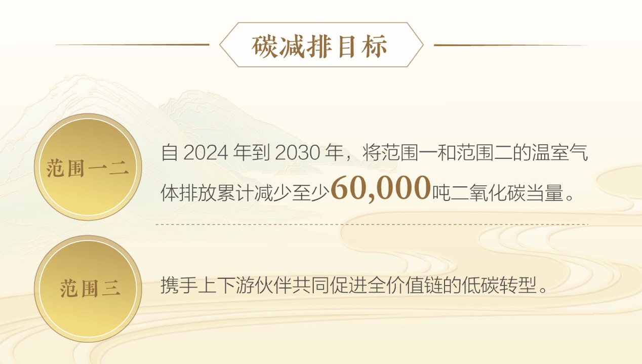 在全球應(yīng)對氣候變化的背景下,水井坊率先邁出關(guān)鍵一步——首次完成覆蓋范圍一、范圍二及范圍三的全價值鏈溫室氣體盤查,并發(fā)布面向2030年的碳減排目標(biāo)。根據(jù)報告,水井坊計劃自2024年至2030年,累計減少范圍一(直接排放)和范圍二(間接排放)溫室氣體至少6萬噸二氧化碳當(dāng)量;同時,通過深化與上下游伙伴合作,推動范圍三(價值鏈相關(guān)排放)的全面低碳轉(zhuǎn)型。這一目標(biāo)的制定不僅契合國際氣候行動趨勢,更標(biāo)志著水井坊將減排責(zé)任從自身運營延伸至全產(chǎn)業(yè)鏈。