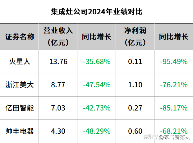 2024年,廚衛(wèi)電器公司過(guò)上“苦日子”,尤其在集成灶領(lǐng)域,業(yè)績(jī)出現(xiàn)2015年以來(lái)最大降幅,4家集成灶為主業(yè)的上市公司實(shí)現(xiàn)盈利,但是營(yíng)收與凈利潤(rùn)“雙降”,凈利潤(rùn)更是全部“腰斬”,凈利降幅超過(guò)68%。