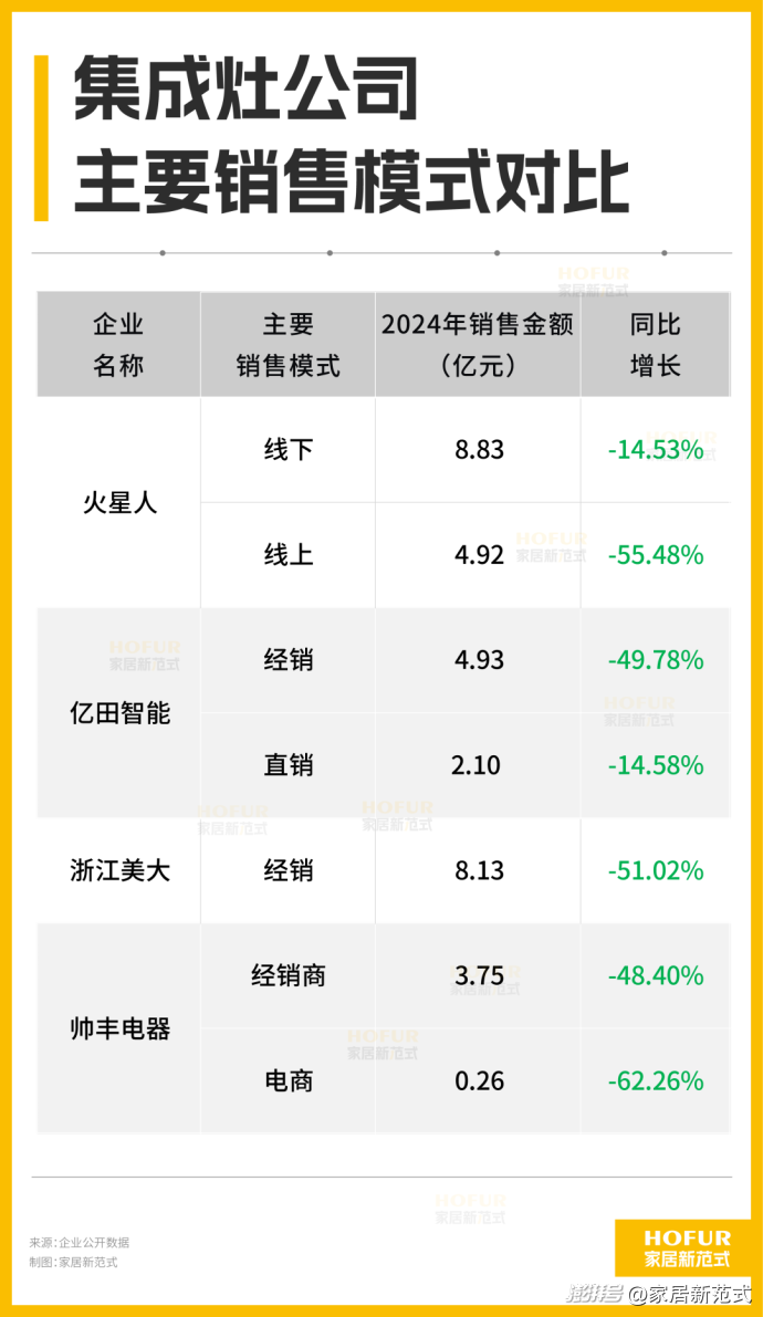 家居新范式發(fā)現(xiàn),浙江美大、帥豐電器和億田智能對(duì)經(jīng)銷(xiāo)商依賴(lài)較為明顯,2024年經(jīng)銷(xiāo)渠道收入占比分別為92.62%、88.74%和70.16%,而經(jīng)銷(xiāo)渠道收入分別同比下滑51.02%、48.40%和49.78%,較2023年銷(xiāo)售收入近乎“腰斬”。
