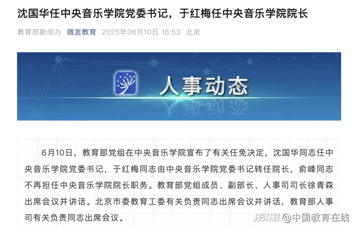 據(jù)教育部政務(wù)新媒體“微言教育”發(fā)布,6月10日,教育部黨組在中央音樂學(xué)院宣布了有關(guān)任免決定,沈國華同志任中央音樂學(xué)院黨委書記,于紅梅同志由中央音樂學(xué)院黨委書記轉(zhuǎn)任院長,俞峰同志不再擔(dān)任中央音樂學(xué)院院長職務(wù)。教育部黨組成員、副部長、人事司司長徐青森出席會(huì)議并講話。北京市委教育工委有關(guān)負(fù)責(zé)同志出席會(huì)議并講話,教育部人事司有關(guān)負(fù)責(zé)同志出席會(huì)議。