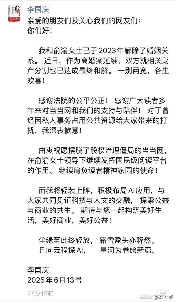 李國慶在6月13日完成和俞渝的財產(chǎn)分割后,在微博上表示自己將積極布局AI應(yīng)用。