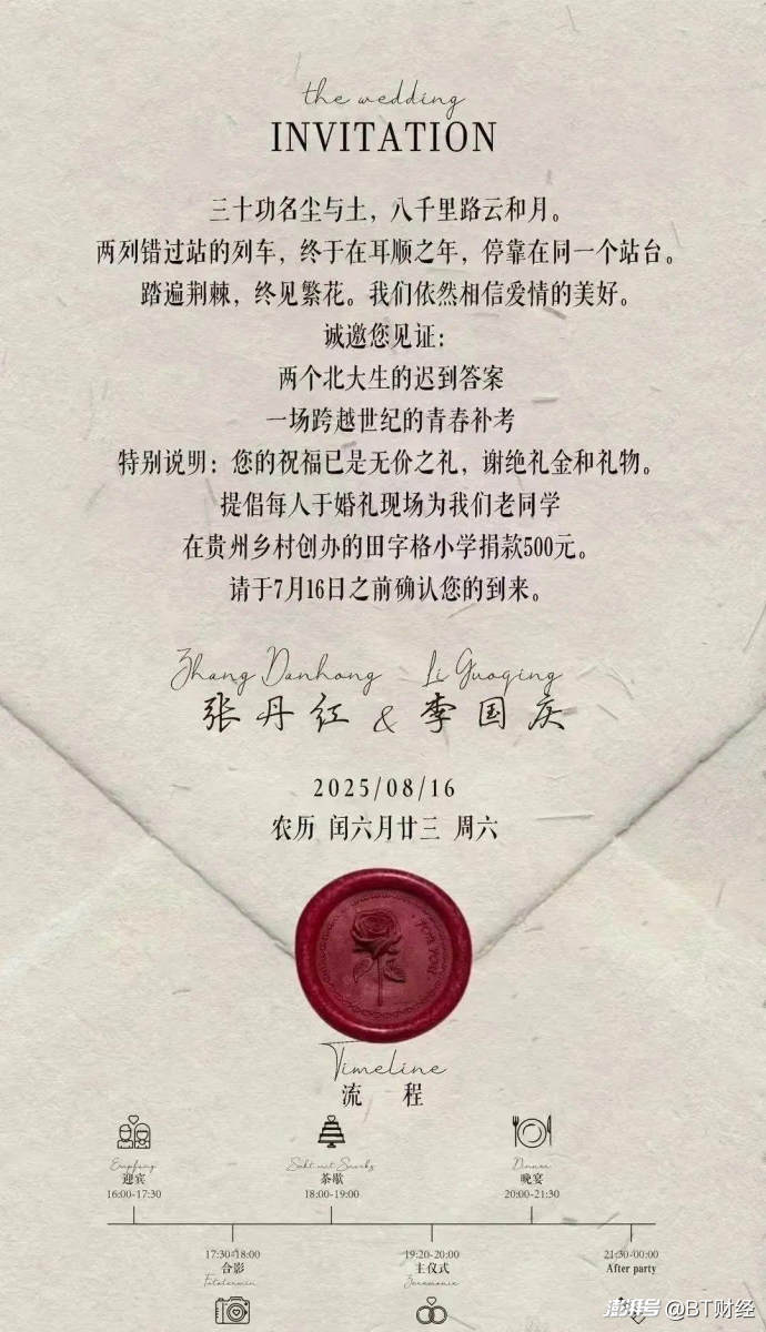 從兩人精心設(shè)計的婚禮請柬可以看出,兩人的愛情充滿詩情畫意的浪漫,“八千里路云和月”最終停靠在同一站臺,“兩個北大生的遲到答卷,一場跨世界的青春補考”更是把李國慶的心跡展露無遺。有意思的是李國慶在請柬上明確注明謝絕禮金和禮物,提倡為貴州鄉(xiāng)村的田字格小學(xué)捐款500元。田字格公益是李國慶北大校友肖詩堅創(chuàng)辦,這波操作又為李國慶的再婚贏得不少贊譽。