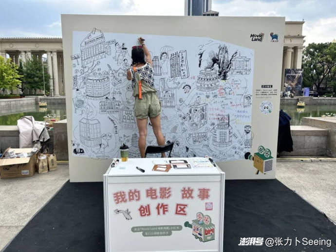 “大象點(diǎn)映”設(shè)計(jì)了“我的電影故事”創(chuàng)作區(qū),由插畫(huà)師先繪制出上海的影劇院地標(biāo)和一些弄堂情境,再由現(xiàn)場(chǎng)影迷觀眾參與共創(chuàng)或上色。僅半天,畫(huà)板上已經(jīng)集聚了眾多留言和涂鴉。除了線下互動(dòng),他們還設(shè)計(jì)了一款小程序,邀請(qǐng)大家根據(jù)里面的citywalk線路圖,到相應(yīng)的電影取景地打卡。影迷小石花了兩天時(shí)間,就集齊了58個(gè)打卡點(diǎn)位,這次特地到市集來(lái)兌換獎(jiǎng)品。“就像武康大樓、郵政博物館、大世界,最近都去過(guò)了。電影節(jié)的電影票當(dāng)然也搶好了,后面要去看《穆赫蘭道》。”