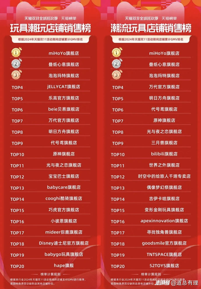 去年,米哈游的miHoYo 旗艦店在雙11狂歡日首小時成交同比2023年翻倍增長,一舉成為天貓雙11第一個破億的潮玩品牌旗艦店,同時它還摘得了天貓雙11玩具潮玩店鋪銷售榜、潮流玩具店鋪銷售榜雙榜第一。在這兩份榜單中,疊紙心意也同時排名第二,其次才是泡泡瑪特。