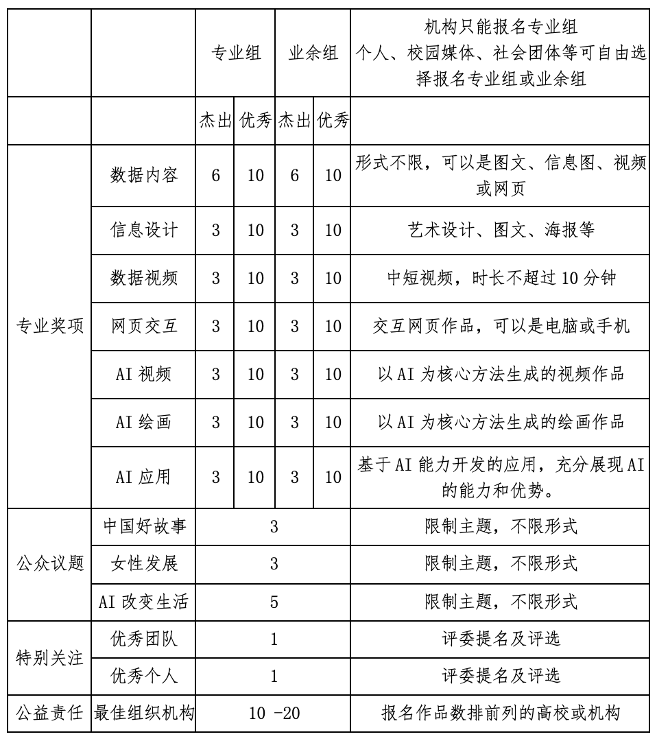 相較于去年,本屆活動在獎(jiǎng)項(xiàng)設(shè)置上進(jìn)一步加大了對AI領(lǐng)域的關(guān)注力度,將專業(yè)獎(jiǎng)項(xiàng)中的“AIGC”類別細(xì)分為“AI視頻”、“AI繪畫”、“AI應(yīng)用”三個(gè)方向,同時(shí)相應(yīng)地?cái)U(kuò)大了獲獎(jiǎng)名額。在公眾議題板塊中,活動延續(xù)了“AI改變生活”專題獎(jiǎng)項(xiàng),重點(diǎn)關(guān)注AI對日常生活、社會發(fā)展產(chǎn)生的多維度影響。