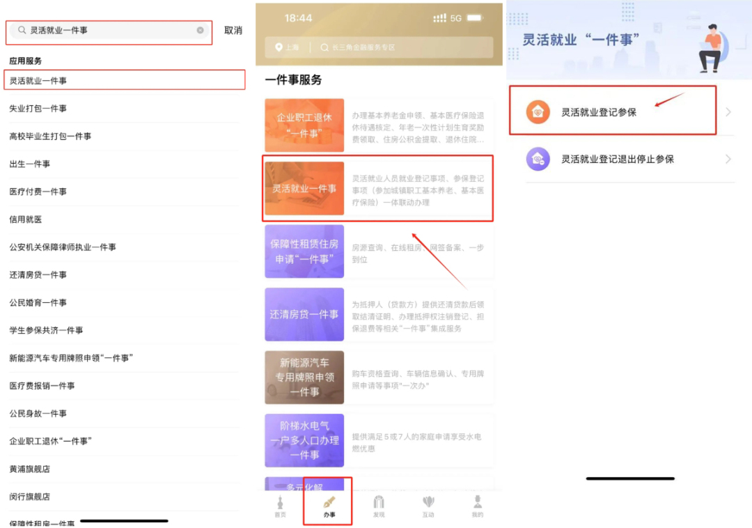 打開“隨申辦市民云”APP,首頁搜索框中輸入“靈活就業(yè)一件事”或點擊首頁下方“辦事”菜單欄,找到“一件事服務(wù)”欄目,即可找到“靈活就業(yè)一件事”。(目前線上僅限本市戶籍、外省市戶籍靈活就業(yè)人員辦理)→選擇靈活就業(yè)登記參保。