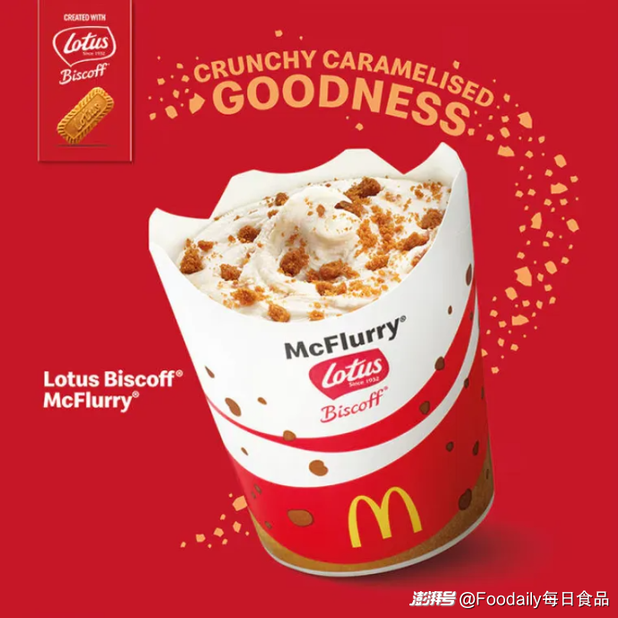 同時,Biscoff也在以餅干為“風味圓心”,通過“配料化”玩法積極拓展產品品類。一方面,Biscoff品牌自身2019年以來陸續(xù)推出了餅干碎冰淇淋、夾心巧克力、夾心餅干等新品;另一方面,品牌也和麥當勞、甜甜圈品牌Krispy Kreme、KitKat、億滋吉百利、哈根達斯等品牌展開了合作,推出添加了Biscoff的麥旋風、甜甜圈、夾心巧克力、冰淇淋等產品,傳播“百搭配料”的影響力,也為Lotus Bakeries創(chuàng)造著更多的營收。