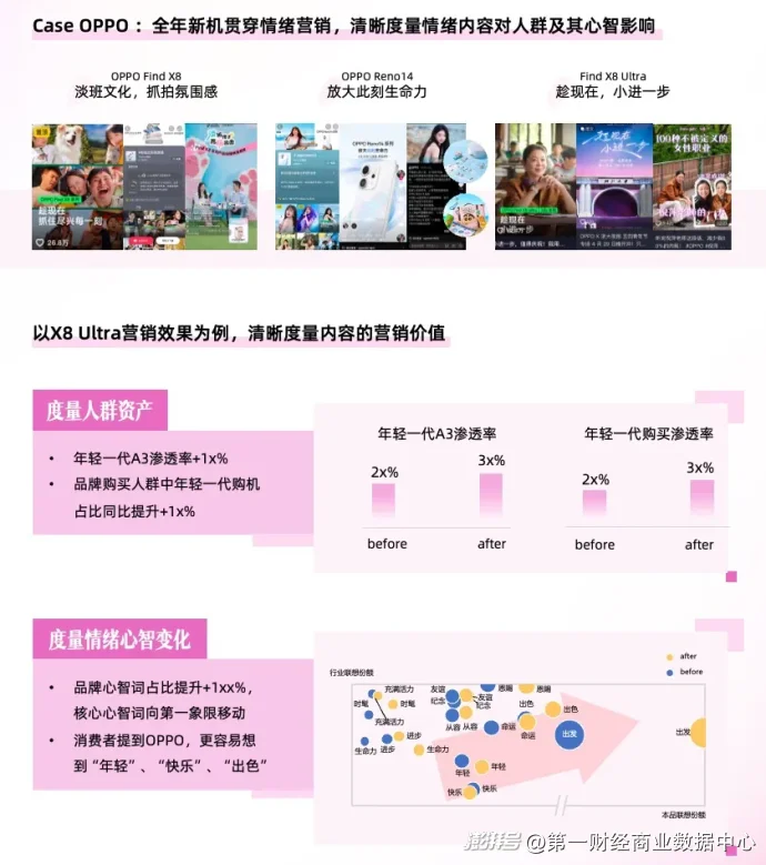 以O(shè)PPO X8 Ultra為例,抖音平臺的情緒營銷貫穿新機發(fā)布和銷售全程,通過對年輕情緒的挖掘和傳播,成功在年輕人中破圈。從人群資產(chǎn)來看,X8 Ultra的年輕一代A3滲透率同比增長1X%,品牌購買人群中年輕一代購機占比同比提升1X%。從情緒心智來看,消費者提到OPPO品牌,更容易想到“年輕”“快樂”“出色”等積極情緒。