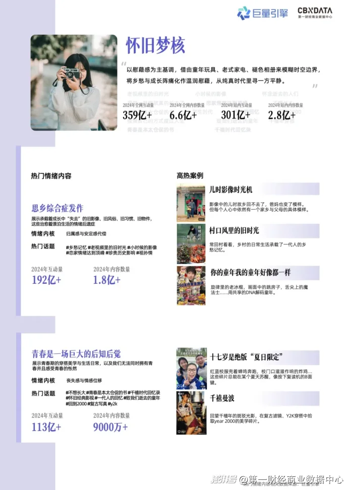 從童年全家福到復古寫真,從復刻老宅到技術(shù)還原舊時光,懷舊情緒的推動下,抖音平臺上,關(guān)于思鄉(xiāng)情切、追憶青春的互動量分別高達192億、113億,帶火了一眾老牌零食、復古穿搭。