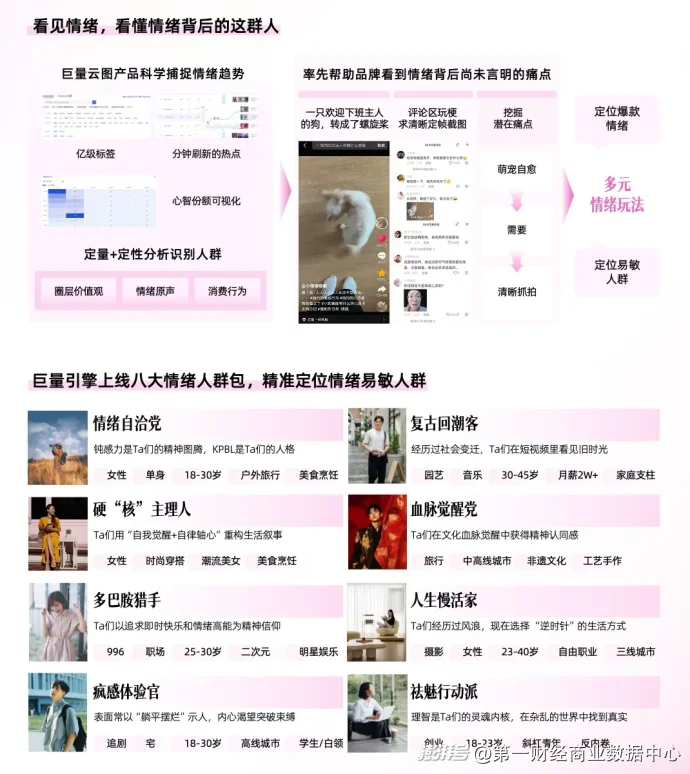 在抖音,依托巨量云圖、巨量星圖等產(chǎn)品工具,品牌能夠從紛繁眾多的內(nèi)容中科學捕捉情緒趨勢,挖掘上升情緒、情緒原聲以及背后的潛在需求。抖音還針對8大情緒心理推出了8大情緒人群包,幫助品牌更精準地定位情緒易敏人群。