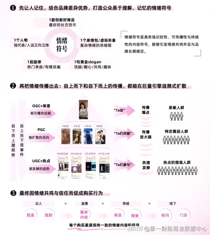 捕捉和識別情緒之后,如何在抖音上將情緒轉(zhuǎn)化為消費者購買行為,則可以通過構(gòu)建情緒符號、破圈傳播、以及站內(nèi)轉(zhuǎn)化購買三個環(huán)節(jié)來實現(xiàn)。