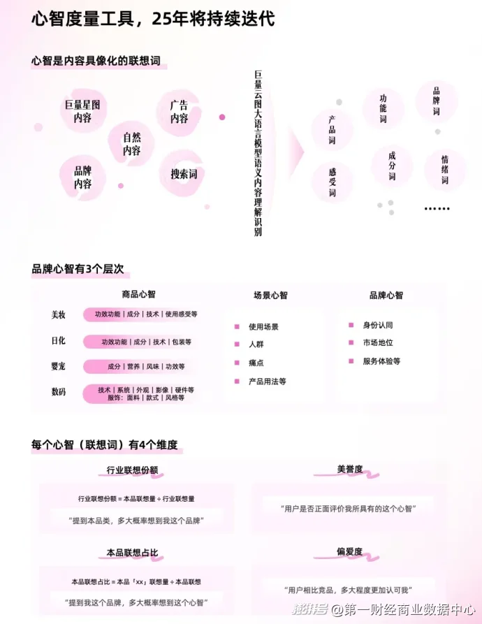 對情緒內(nèi)容的觸達效率則可以利用巨量云圖25年大力組建的品牌心智體系進行評估,心智提取的是商業(yè)+用戶自然的內(nèi)容標簽,將用戶對優(yōu)質(zhì)內(nèi)容的反饋拆解成「商品」層、「場景」層、「品牌」層3個維度的標簽,聚類后,品牌可以清晰的看到,將什么樣的情緒心智牢牢種在了用戶心里,又有哪些心智是其他品牌正在發(fā)力的。