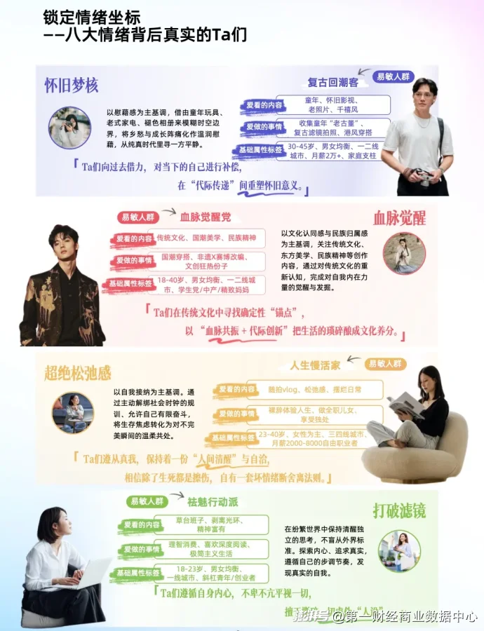 復雜之處在于,情緒往往難以捕捉和定位,這迫使品牌商家建立完善精準的消費者情緒畫像,更好地讀懂情緒。通過圈定高感染力的底層情緒、采集主流社媒熱點內(nèi)容、用科學算法聚合社媒爆款情緒等方法,八種典型的情緒心理得以描摹出來——喚醒自愈、重塑內(nèi)核、多巴胺爽感、一觸即瘋、懷舊夢核、血脈覺醒、超絕松弛感和打破濾鏡。同時,通過對八大情緒的易敏人群特征進行分析,不同情緒的人群畫像也更加清晰。