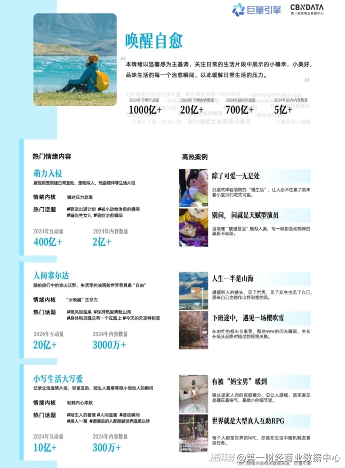 情緒自洽黨更關(guān)注生活細枝末節(jié)的溫暖敘事,容易在深夜受情緒影響進行消費,能引起認同感和共鳴感的“共情”消費是他們的心頭好。不管是探索創(chuàng)新體驗的內(nèi)心療愈之旅,還是興趣休閑、手作、去戶外等日常充電行,抑或享受萌娃、萌寵帶來的情緒價值,都能幫助其實現(xiàn)自愈。