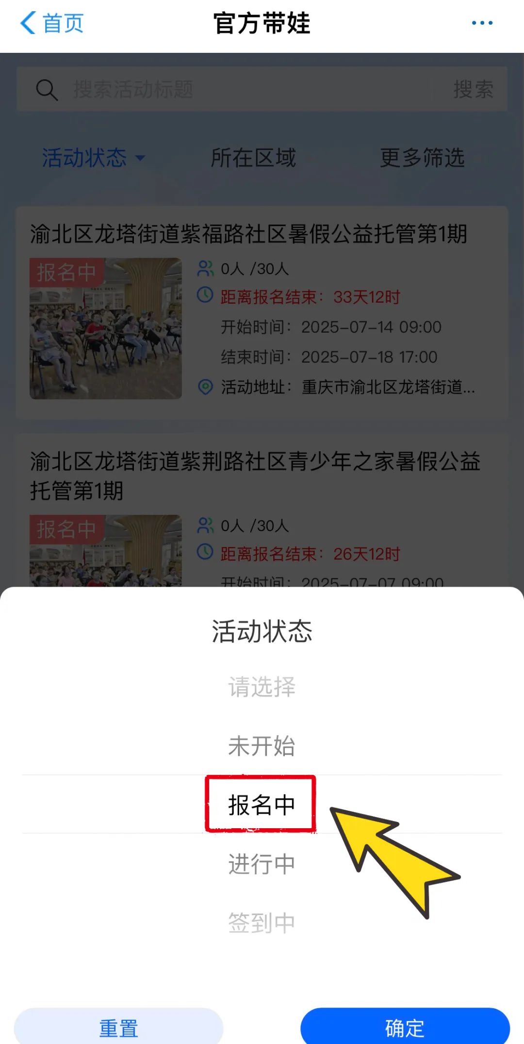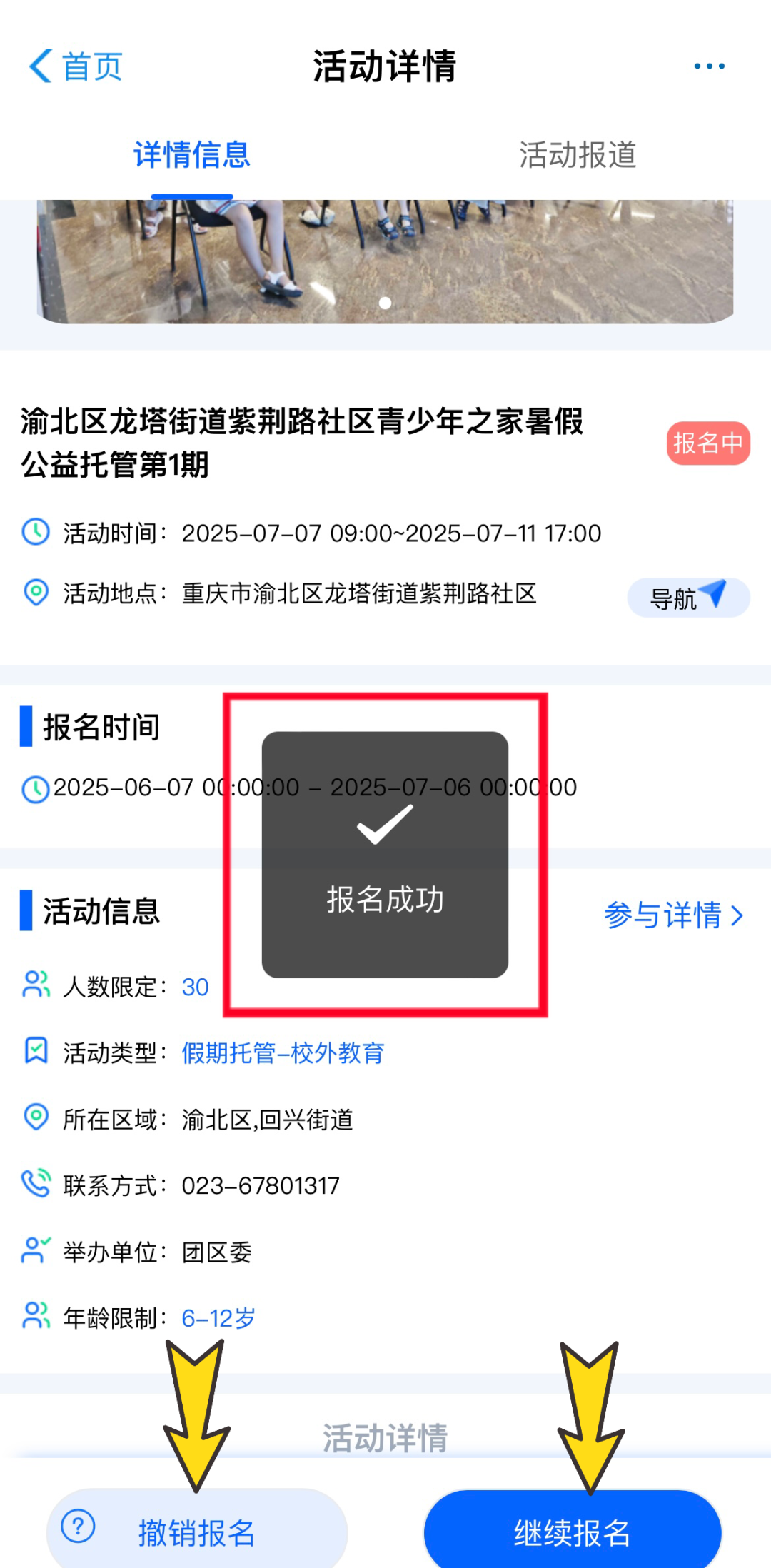 3.進(jìn)入報(bào)名列表查看“假期公益托管營”行動(dòng)報(bào)名詳情。其中,狀態(tài)顯示為“報(bào)名中”且名額未滿的,可進(jìn)入“活動(dòng)詳情”頁面點(diǎn)擊“立即報(bào)名”。