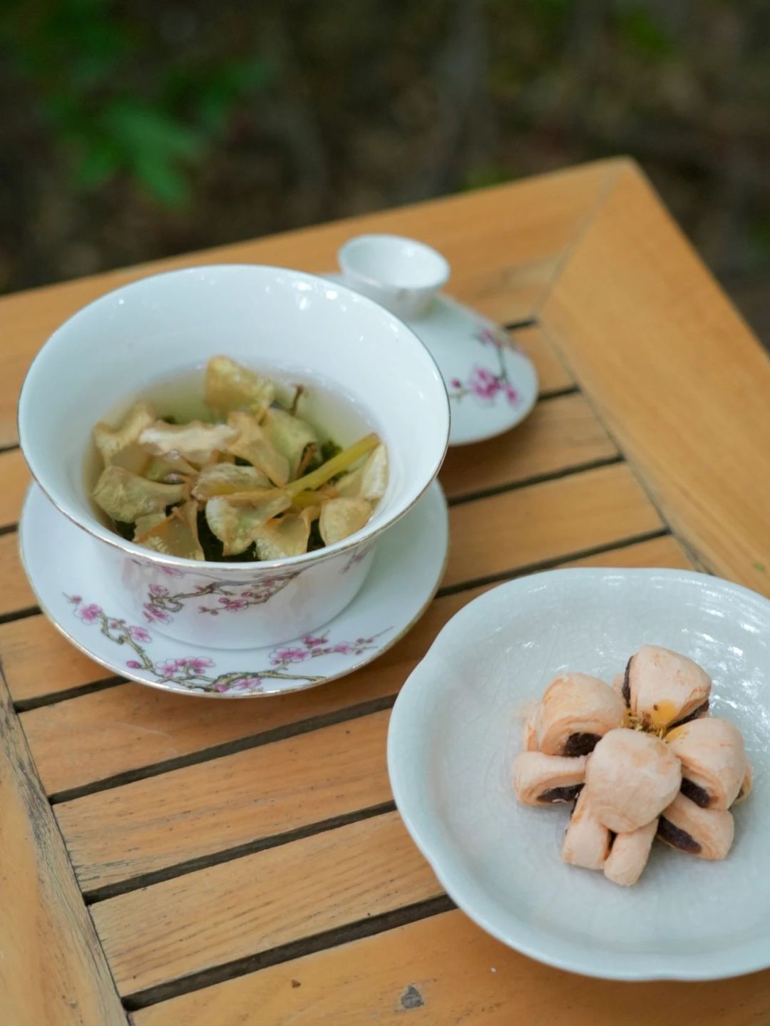 梅花點彩的瓷盞,揭開蓋便是撲鼻的梔子香;點心透著精致,山楂餡酸中帶甜,酥皮微硬,配著茶湯吃柔潤了一些。