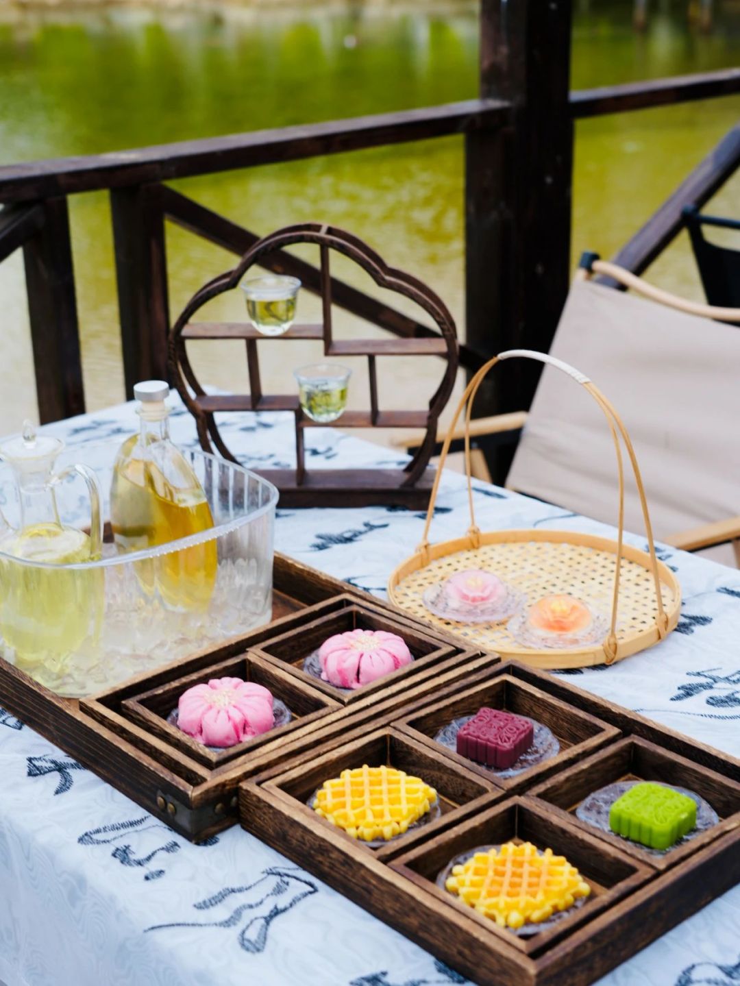 尋得樹下一處空位,偶有果子“吧嗒”掉落。一壺梔子烏龍茶、一碟山楂如意酥,開啟獨處慢時光。