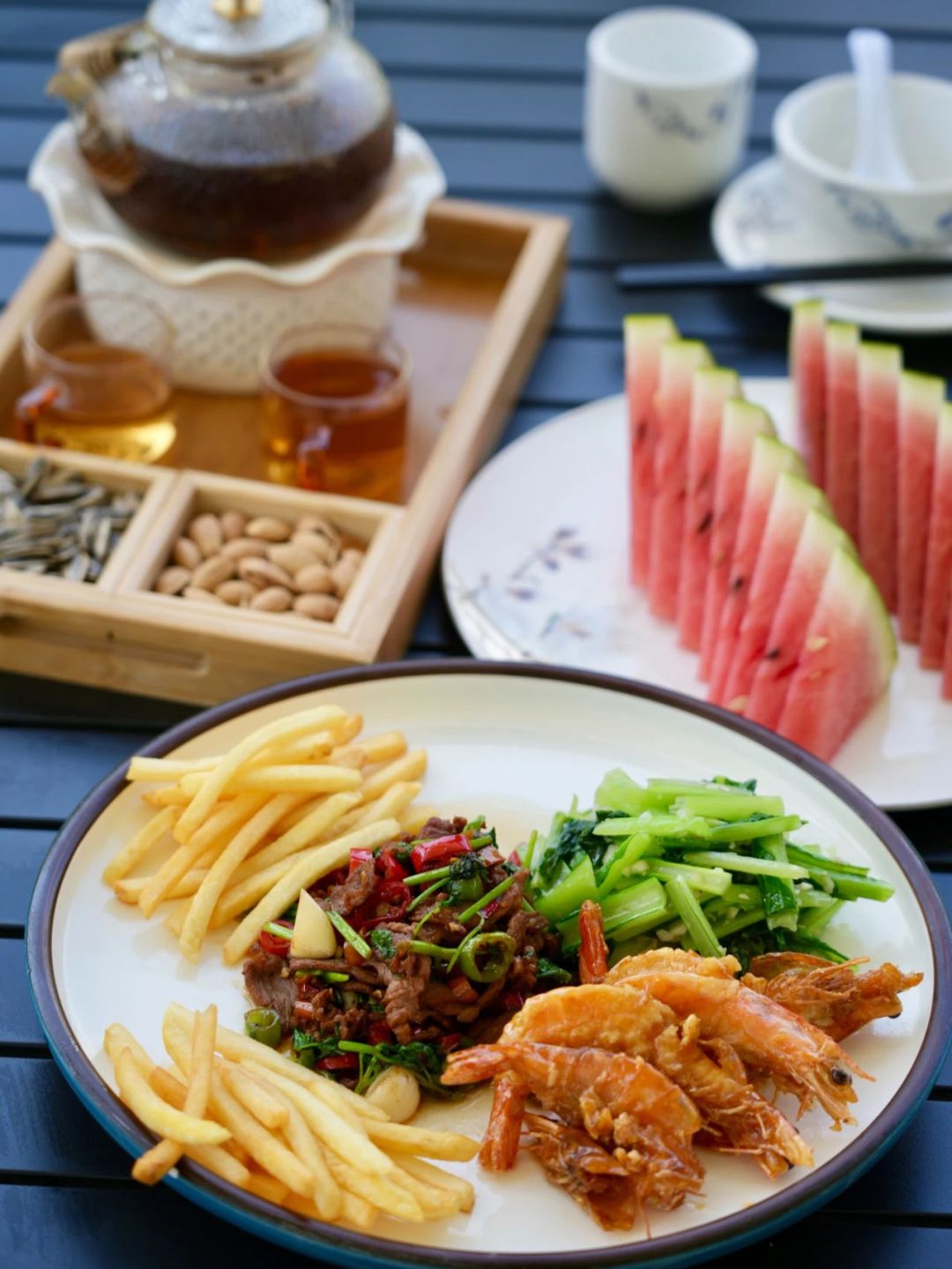 喝完茶,一人食拼盤便上了桌。酥皮蝦炸出透亮的糖殼,是糖醋味,懶人狂喜的連殼吃法。小炒黃牛肉很下飯,夾一筷清炒時蔬中和咸鮮。