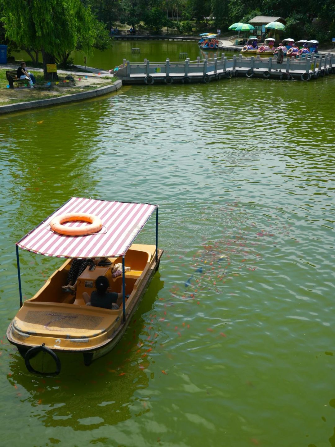 邊吃著,湖景成了最好的下飯菜。摩天輪就在眼前轉(zhuǎn)悠;湖船慢悠悠地從眼前漂過去,金色魚群追著船游。