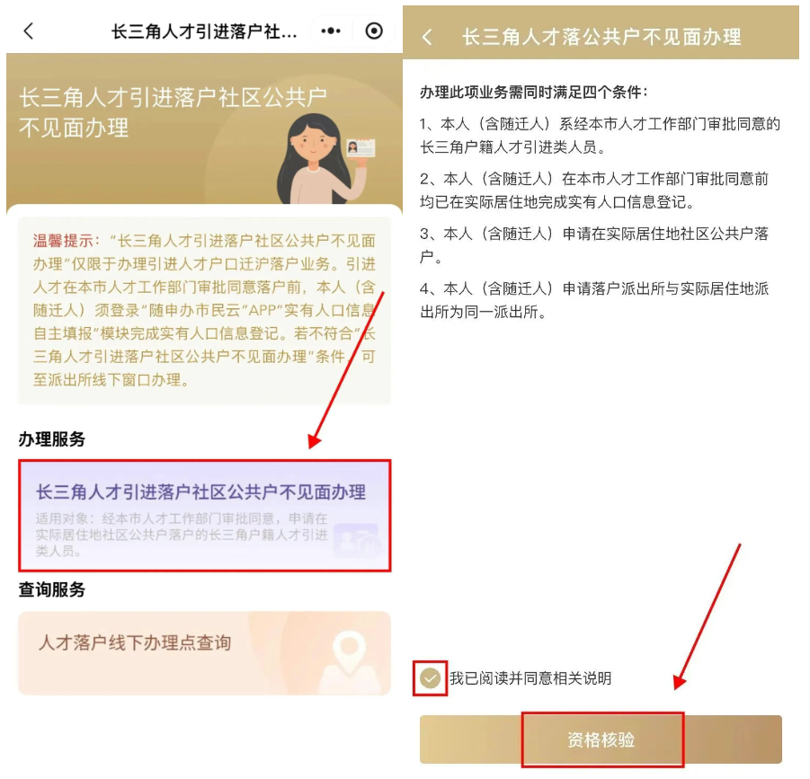 在專欄中,選擇“長(zhǎng)三角人才落戶共戶不見面辦理”,確認(rèn)是否同時(shí)滿足四個(gè)條件,確認(rèn)無(wú)誤后勾選并點(diǎn)擊“資格核驗(yàn)”。