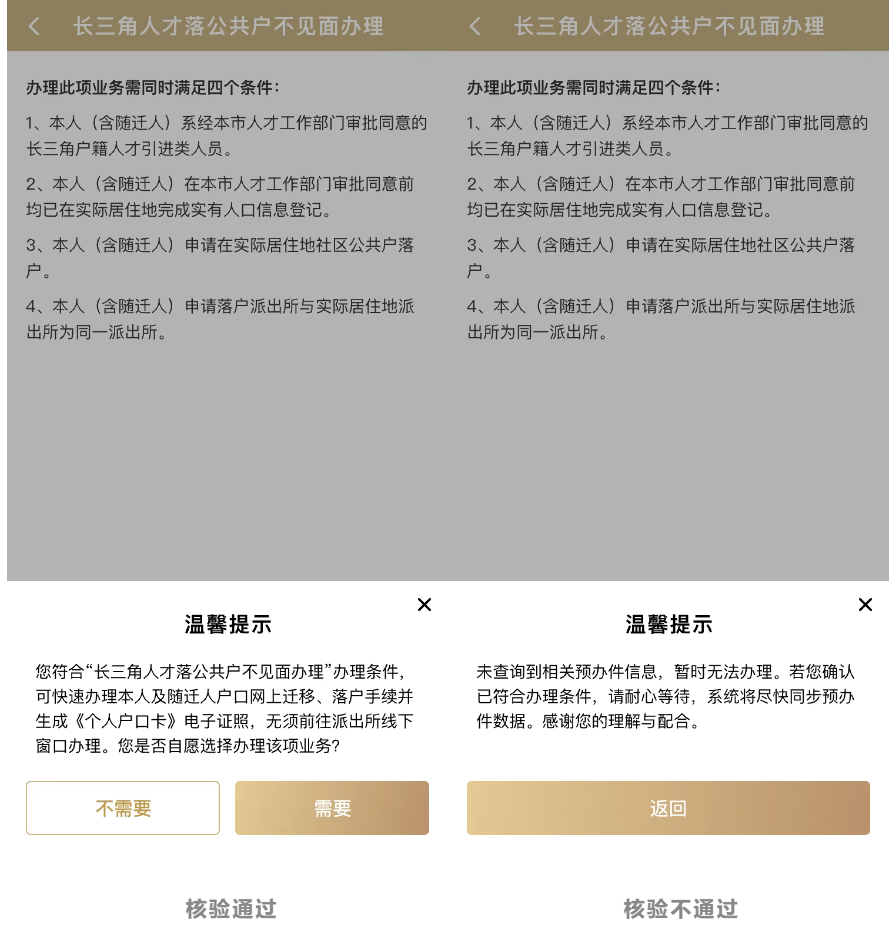 核驗(yàn)結(jié)果將展示以下兩個(gè)中的任一溫馨提示彈窗: