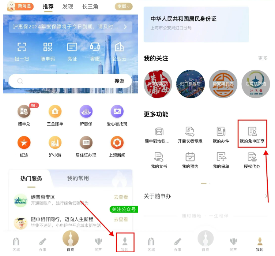打開“隨申辦市民云”APP,點(diǎn)擊底部“我的”,下拉至“更多功能”,點(diǎn)擊“我的免申即享”,即可查詢相關(guān)辦理進(jìn)度。