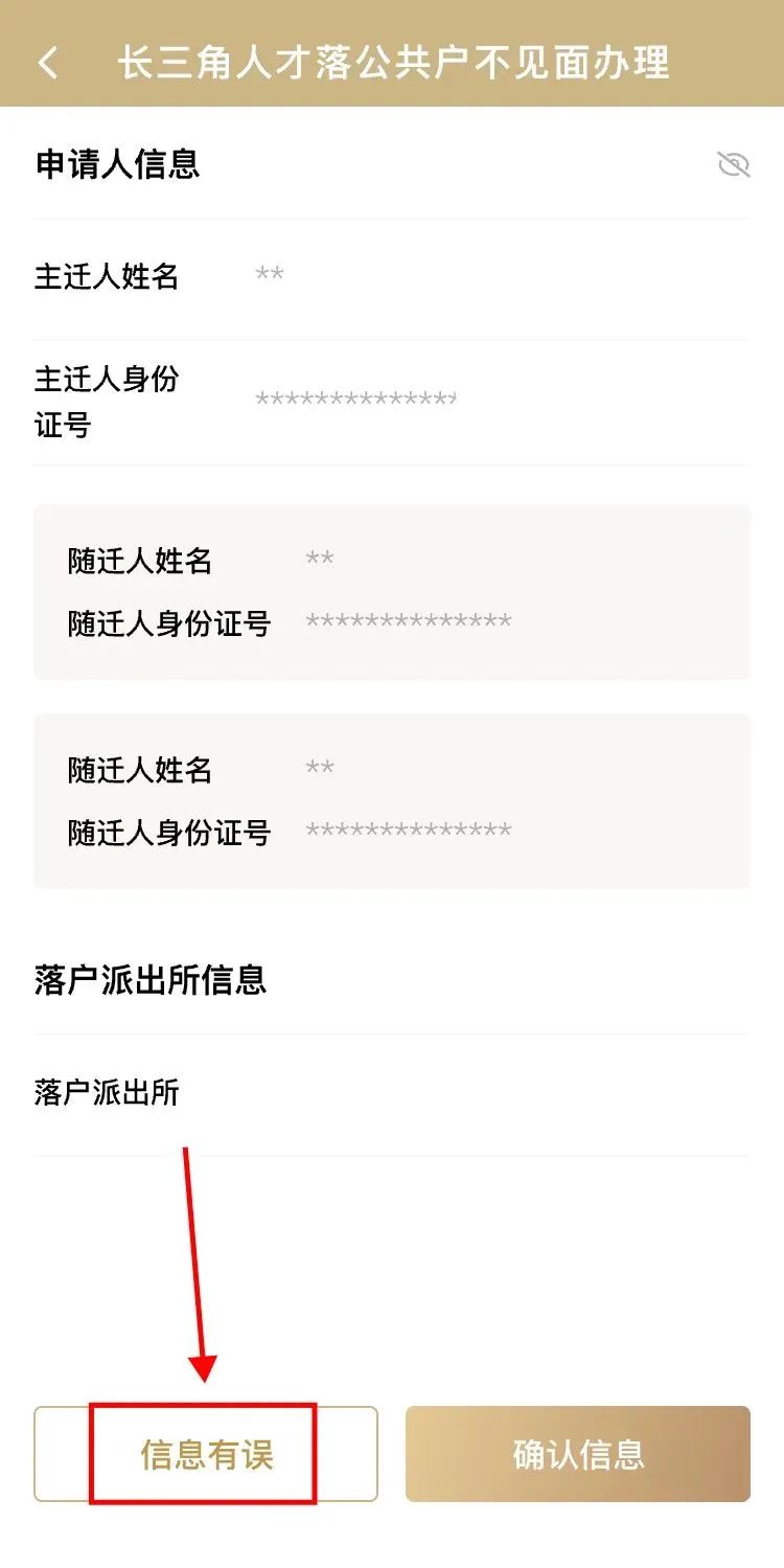 若申請(qǐng)人在信息頁(yè)面發(fā)現(xiàn)信息存在錯(cuò)誤,請(qǐng)點(diǎn)擊“信息有誤”選項(xiàng)。隨后按照系統(tǒng)指示退出當(dāng)前辦理界面,并前往落戶地派出所線下窗口辦理相關(guān)業(yè)務(wù)。