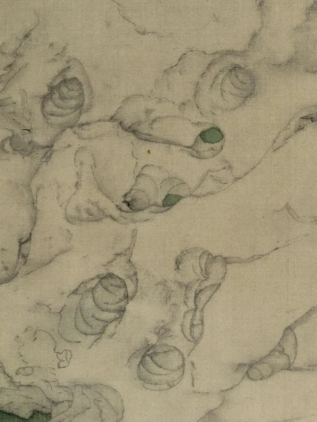 把“石”和“太湖”真正的聯(lián)系起來,正是這次“如石”畫石之行。從石公山到藝圃,從烤串到三白,這下對太湖石的印象又加深了不少。古人也許很在意把物以地域特點來命名,這便有了西湖龍井、宣紙,太湖石的名稱便不奇怪了,這遠比用“石灰?guī)r浸蝕石”要文化的多。文人參與了,就有了皺、漏、瘦、透,也就有了梅以曲為美,也就有了賞石家、藏石家和造園家。開始畫石,是臨《祥龍石》。被密密麻麻的彈子窩所深深吸引,之后又以被譽為北太湖的“青州石”為素材。南方多秀美,北方多渾厚,南方多波濤萬古痕,北方多敦厚雄奇。人如是,物如是,文化亦如是。