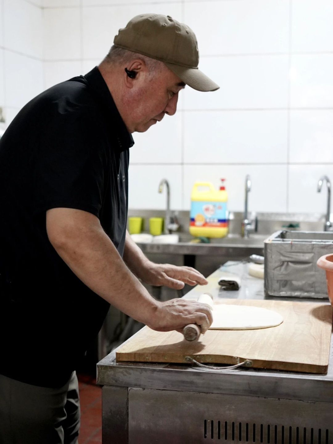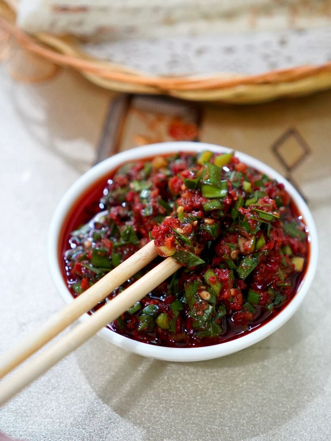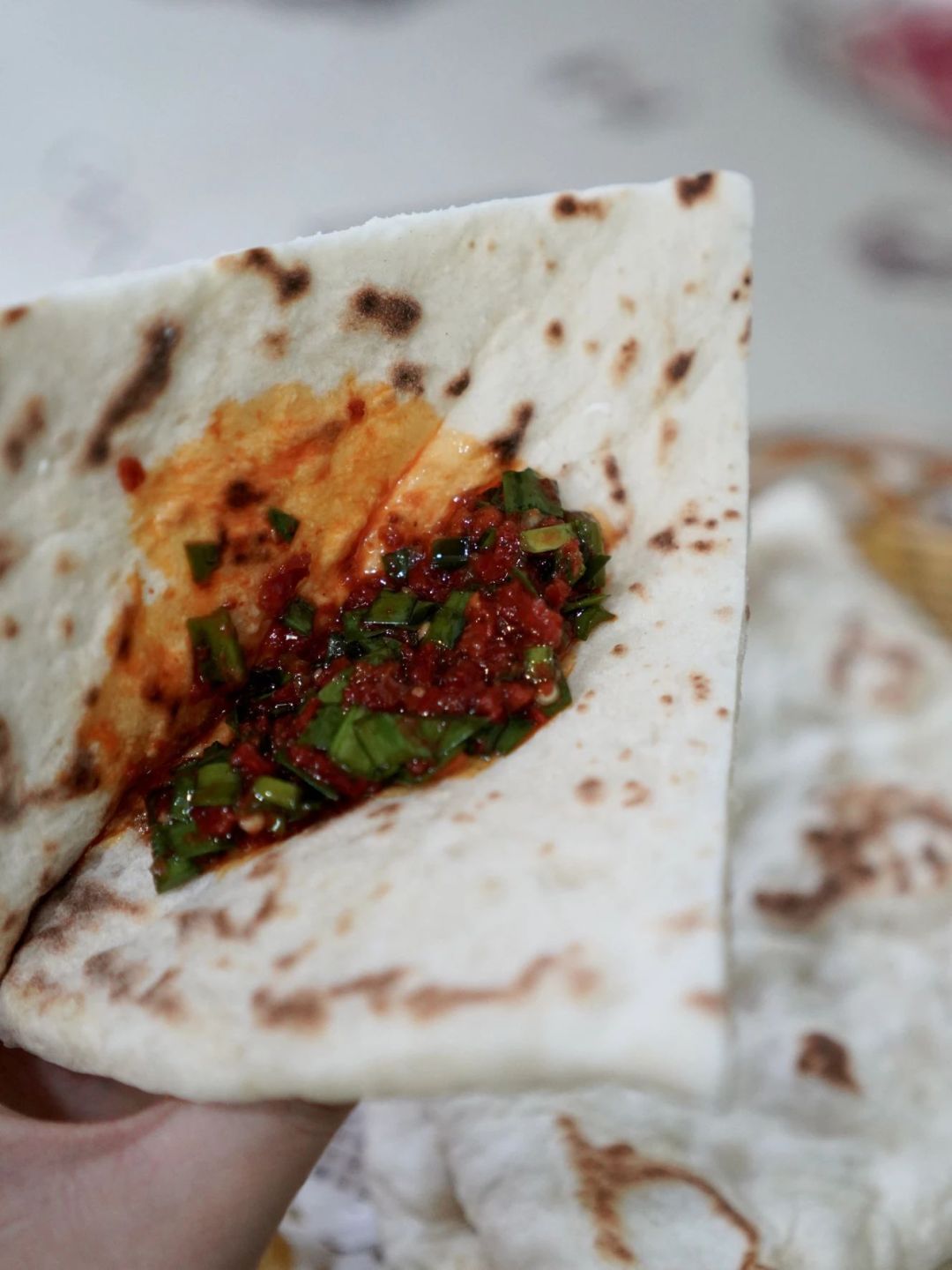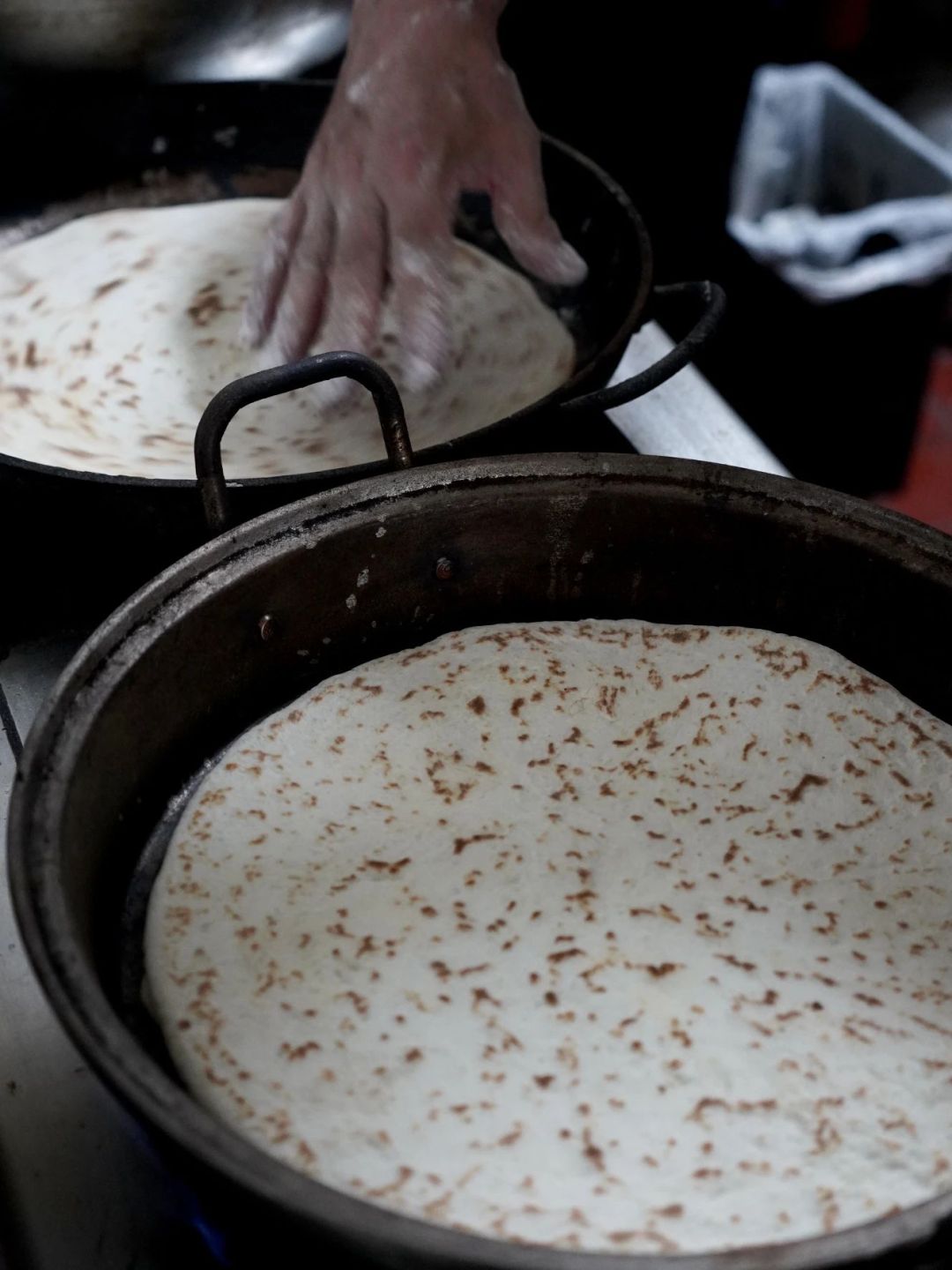 剛出鍋的餅子輕按回彈,咬下時(shí)還有綿密氣孔,滲出麥香氣。搭配韭菜辣醬,麥香與鮮、辣在舌尖迸發(fā)。