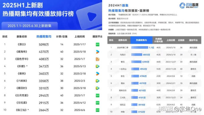 根據(jù)云合數(shù)據(jù),2025年上半年,長視頻平臺共上新271部劇集,比去年同期的237部略有增加。但從劇集熱播期集均有效播放來看,數(shù)據(jù)卻全面縮水。