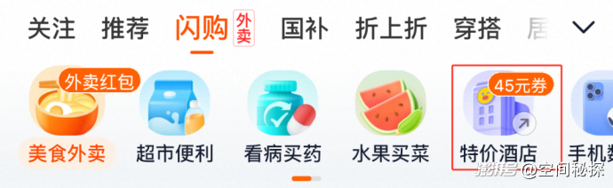 作為淘齡多年的“資深玩家”,自然是不會(huì)錯(cuò)過這次的薅羊毛大戰(zhàn)。在點(diǎn)開淘寶閃購(gòu)準(zhǔn)備買早餐時(shí),發(fā)現(xiàn)主頁(yè)面上多了新的補(bǔ)貼方向——“特價(jià)酒店”。
