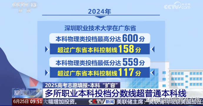 深圳職業(yè)技術(shù)大學(xué)2023年6月升格為職業(yè)本科,首次在廣東本科批次招生時(shí),物理類投檔最高分?jǐn)?shù)達(dá)595分。這一分?jǐn)?shù)可以進(jìn)入暨南大學(xué)、華南師范大學(xué)、深圳大學(xué)等名校就讀。