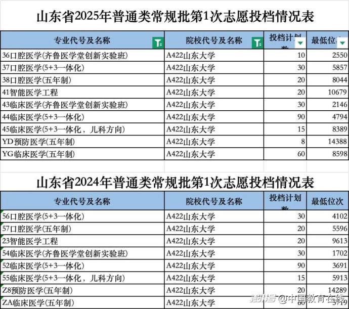 此外,在山東省,各大高校臨床醫(yī)學(xué)的錄取分?jǐn)?shù)線也有普遍下跌趨勢(shì)。例如,山東大學(xué)臨床及相關(guān)專業(yè)的投檔最低位次較2024年有明顯下降,其中,臨床醫(yī)學(xué)(五年制),錄取位次號(hào)從2024年的5719位下降到了2025年的8598位,位次下滑2879位。臨床醫(yī)學(xué)(5+3一體化,兒科方向)錄取位次號(hào)從2024年的5913位下降到了8389位,位次下滑2476位。