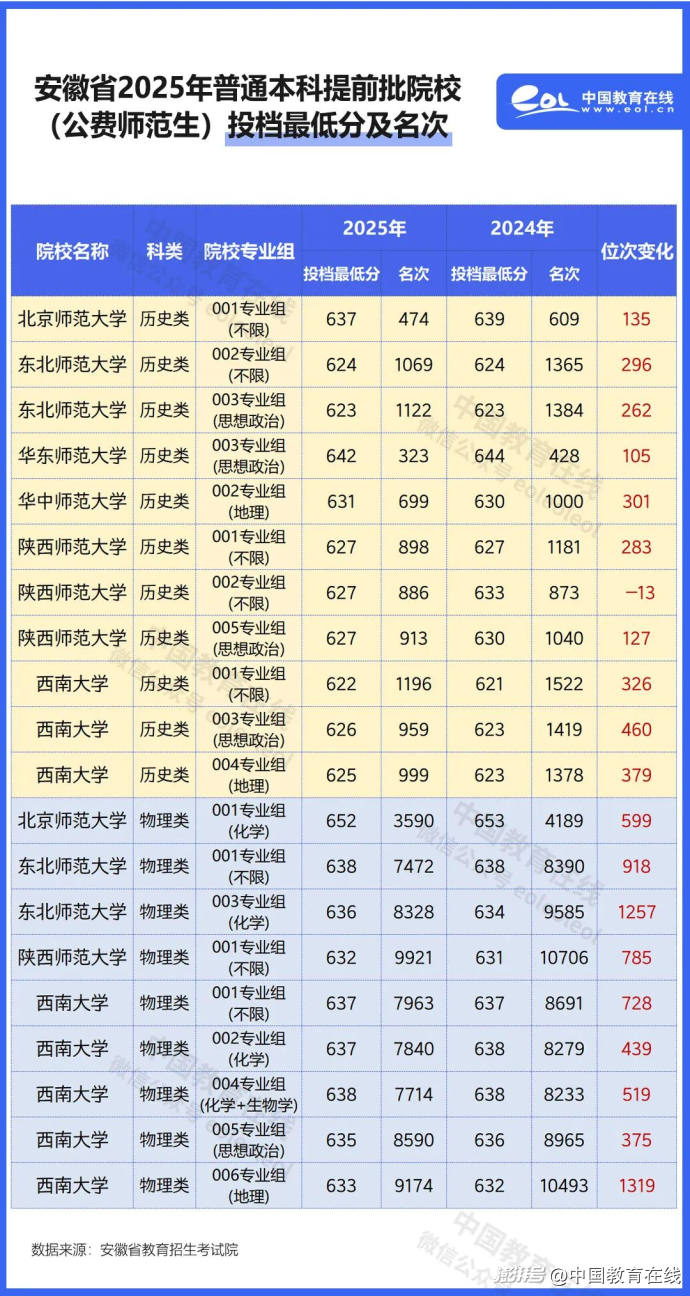 在安徽省的公費(fèi)師范生錄取中,北京師范大學(xué)等6所部屬師范院校今年的招生分?jǐn)?shù)線與去年持平,但在位次變化上,較去年幾乎全線上漲。西南大學(xué)物理類006專業(yè)組(地理)今年投檔最低名次為9174位,較去年前移1319位。