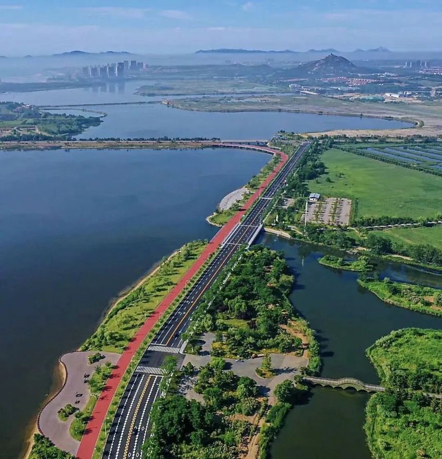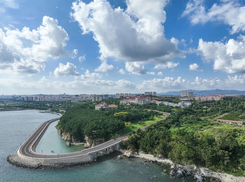 在尋山街道的青魚灘有一條半島環(huán)海公路,一側(cè)是蔥郁起伏的山巒,另一側(cè)是碧波細浪的大海,中間是黃色的隔離線,仿佛像一條優(yōu)雅的飄帶系在山海之間,被網(wǎng)友稱作是“彩虹公路”。