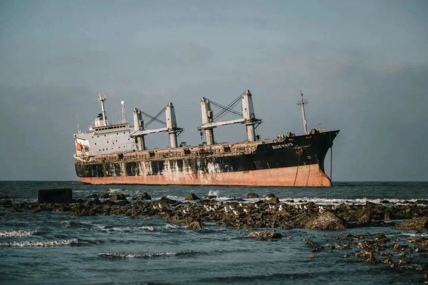 布魯威斯號沉船船身長百米,斑駁的紅褐色鐵銹爬滿船舷,船身斜倚在碧浪里,像被大海收藏的鋼鐵詩篇。