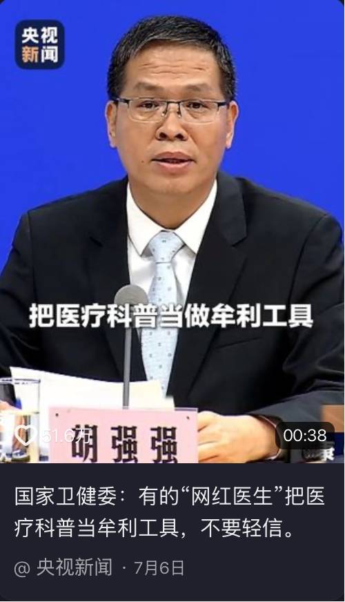 7月,國家衛(wèi)生健康委在一場新聞發(fā)布會(huì)指出,部分“網(wǎng)紅醫(yī)生”把醫(yī)療科普當(dāng)作牟利工具,通過夸大治療效果、虛構(gòu)病例、杜撰故事等手段誤導(dǎo)公眾、斂財(cái)牟利。