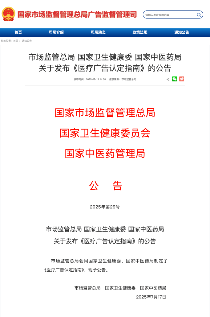 (圖為《醫(yī)療廣告認(rèn)定指南》官方發(fā)布頁面)