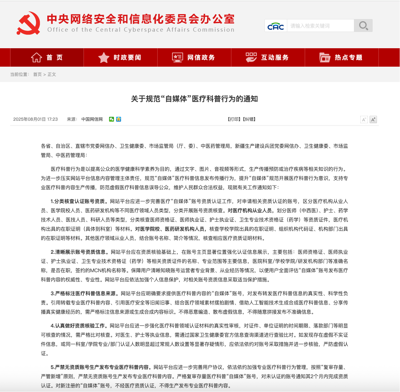 8月1日,中央網(wǎng)信辦等四部門聯(lián)合印發(fā)《關(guān)于規(guī)范“自媒體”醫(yī)療科普行為的通知》,明確要求“自媒體”賬號對發(fā)布轉(zhuǎn)發(fā)醫(yī)療科普信息的真實(shí)性、科學(xué)性負(fù)責(zé),嚴(yán)禁無資質(zhì)賬號生產(chǎn)發(fā)布專業(yè)醫(yī)療科普內(nèi)容。