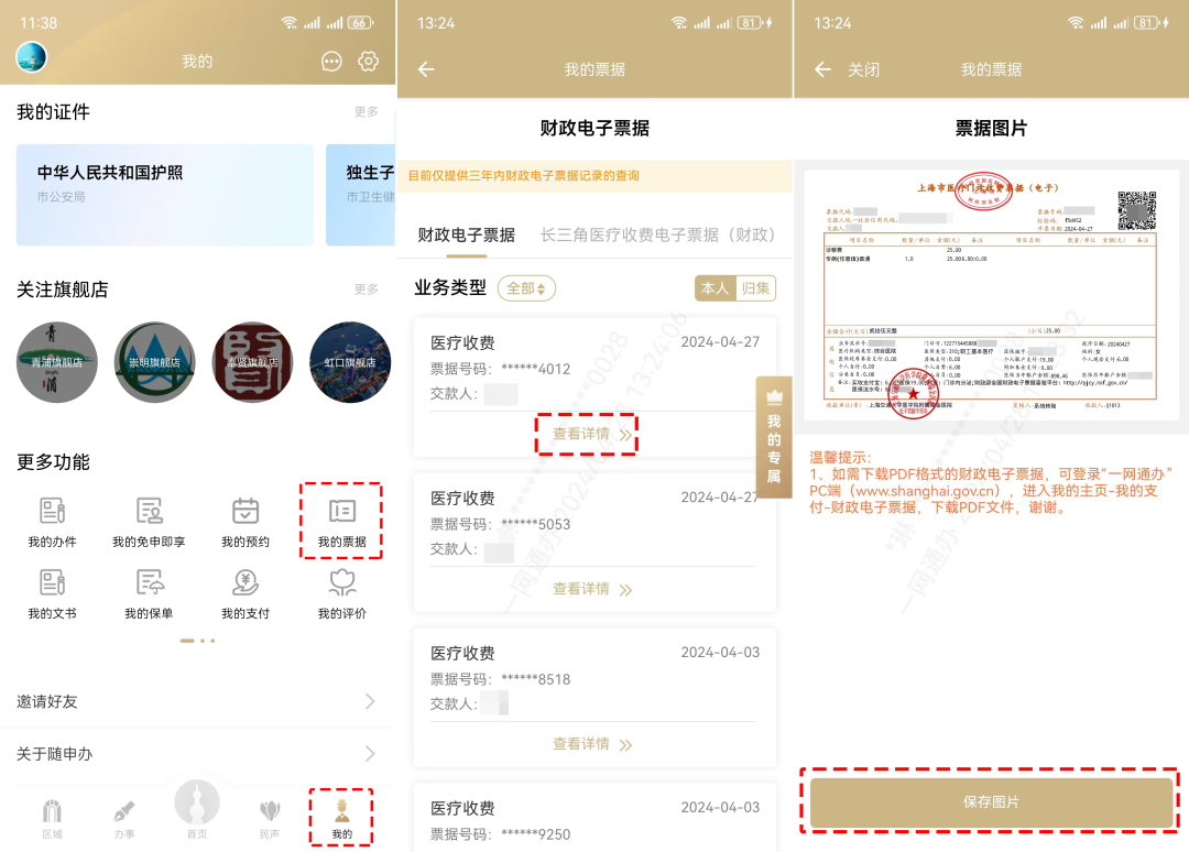 登錄“隨申辦市民云”APP→進(jìn)入“我的”頻道→點(diǎn)擊“我的票據(jù)”→點(diǎn)擊需要查看的票據(jù)下方的“查看詳情”→點(diǎn)擊“保存圖片”,即可將電子票據(jù)保存至手機(jī)相冊中。