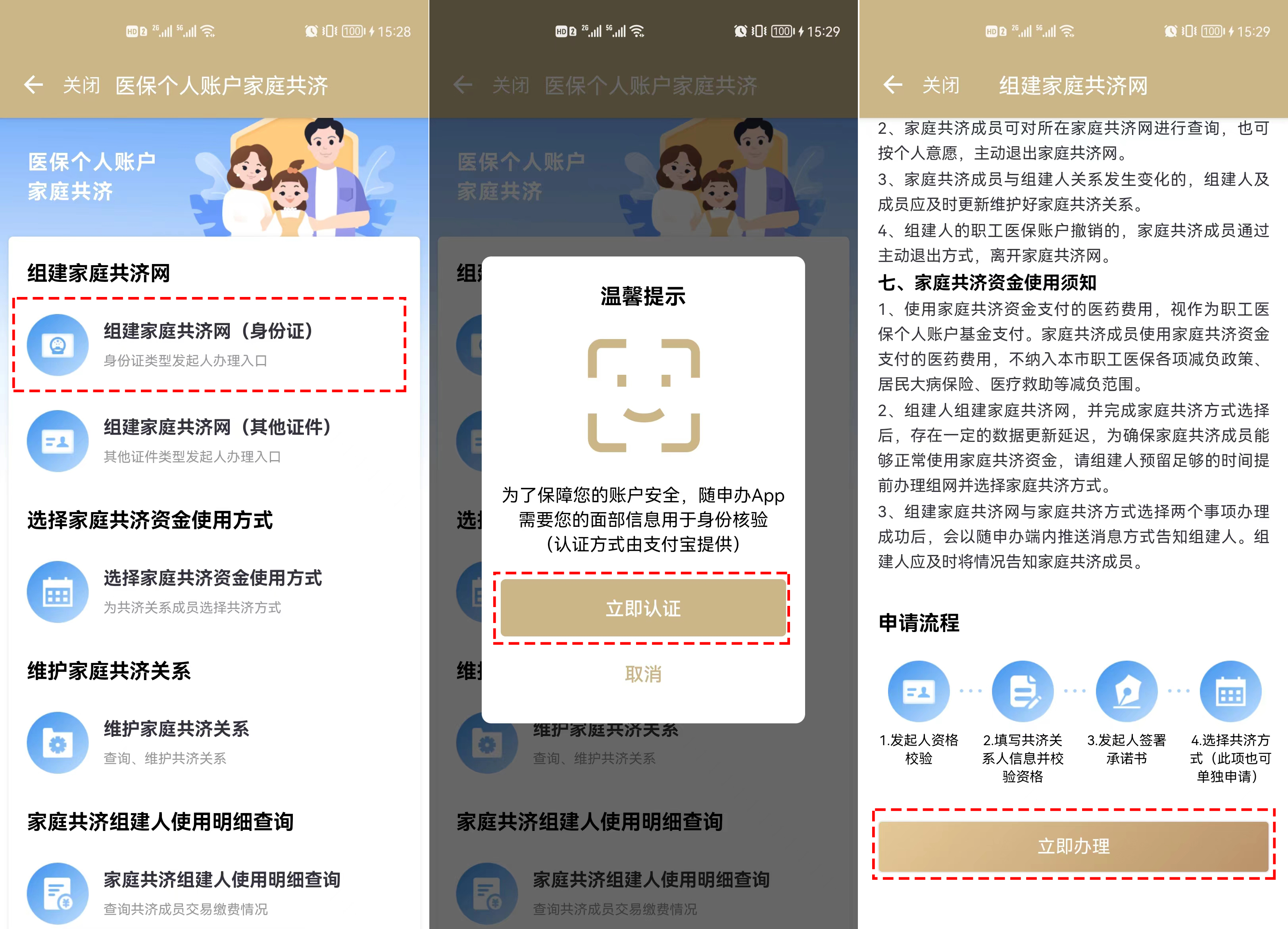 (以“身份證類型發(fā)起人辦理入口”進(jìn)入操作為例):點(diǎn)擊“組建家庭共濟(jì)網(wǎng)”(身份證)→人臉識別→立即辦理;