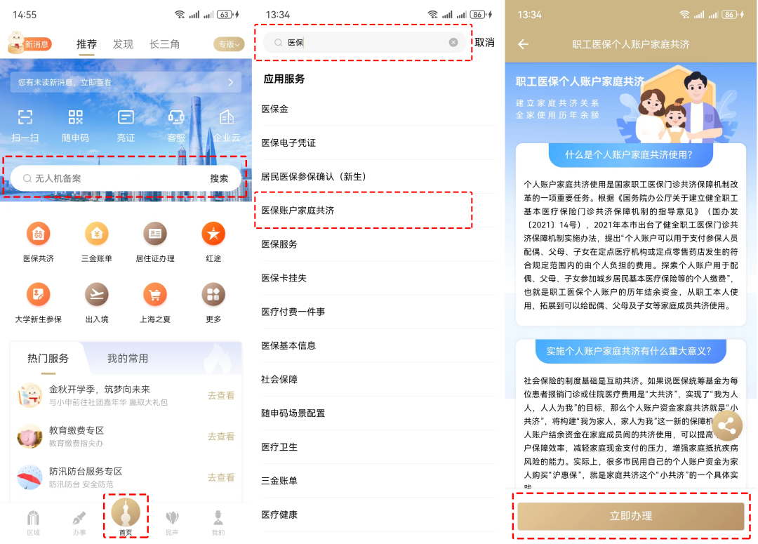 1、實(shí)名登錄“隨申辦市民云”APP→搜索關(guān)鍵字“醫(yī)保共濟(jì)”→點(diǎn)擊“醫(yī)保賬戶家庭共濟(jì)”進(jìn)入服務(wù)專區(qū)→點(diǎn)擊“立即辦理” ;