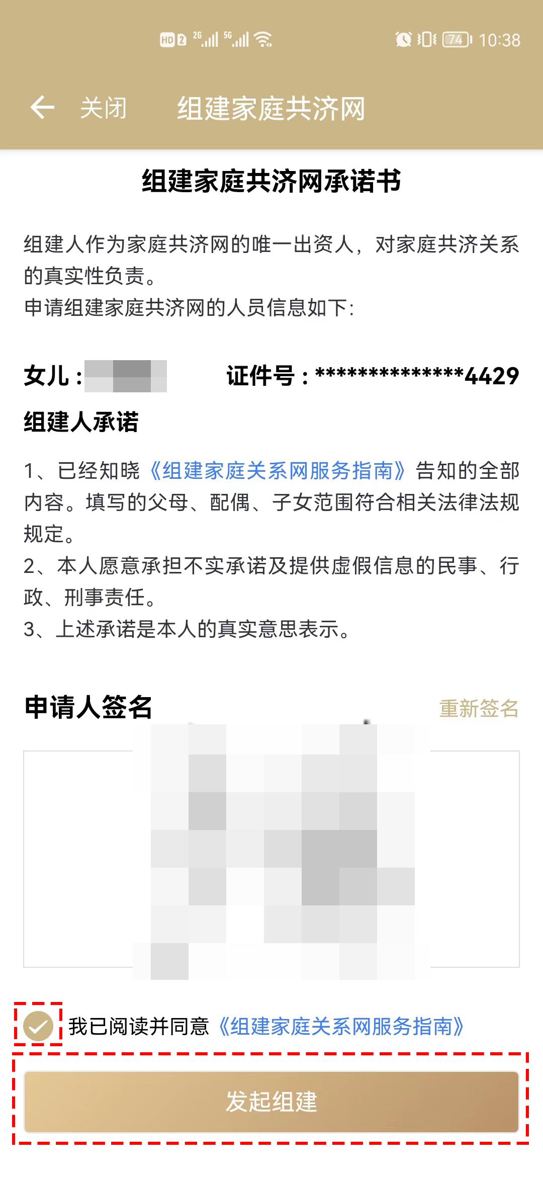 4、確認(rèn)共濟(jì)人信息→發(fā)起人電子簽名→勾選我已閱讀并同意《組建家庭關(guān)系網(wǎng)服務(wù)指南》→點(diǎn)擊“發(fā)起組建”;