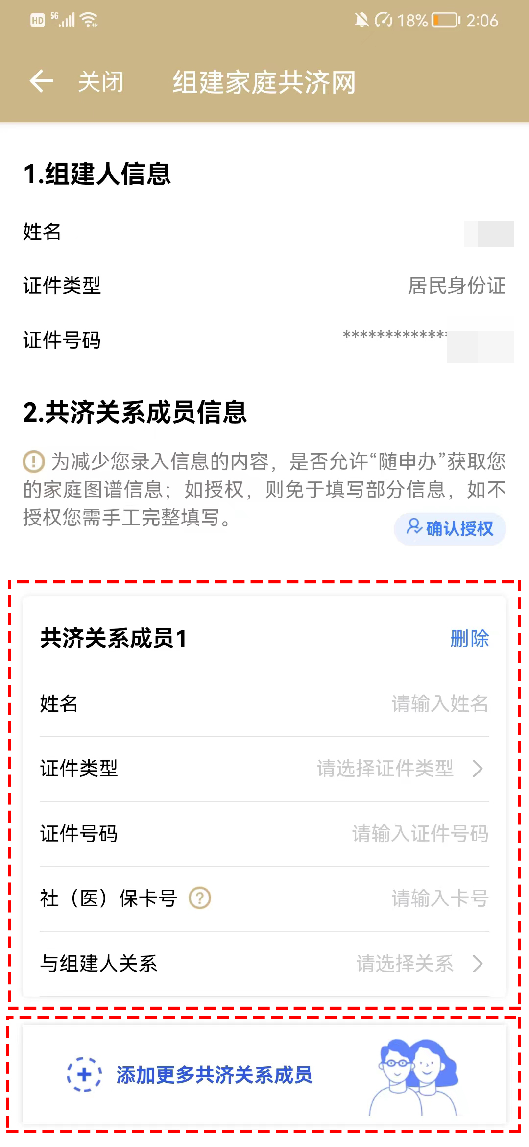 3、可通過手動(dòng)輸入“共濟(jì)關(guān)系人”信息(姓名、證件類型、證件號碼、社??ㄌ?、與組件人關(guān)系)添加共濟(jì)關(guān)系成員;