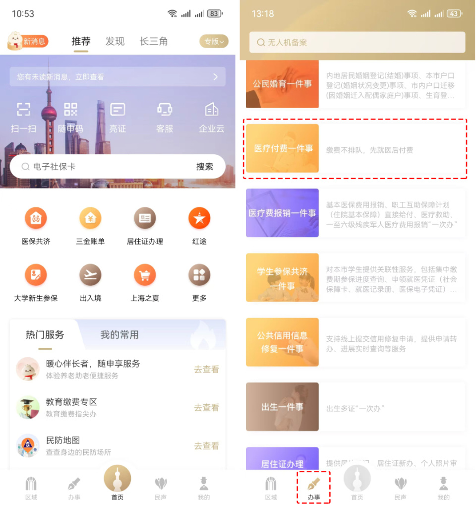 實(shí)名登錄“隨申辦市民云”APP→點(diǎn)擊“辦事”頻道→點(diǎn)擊“醫(yī)療付費(fèi)一件事”進(jìn)入服務(wù)頁;