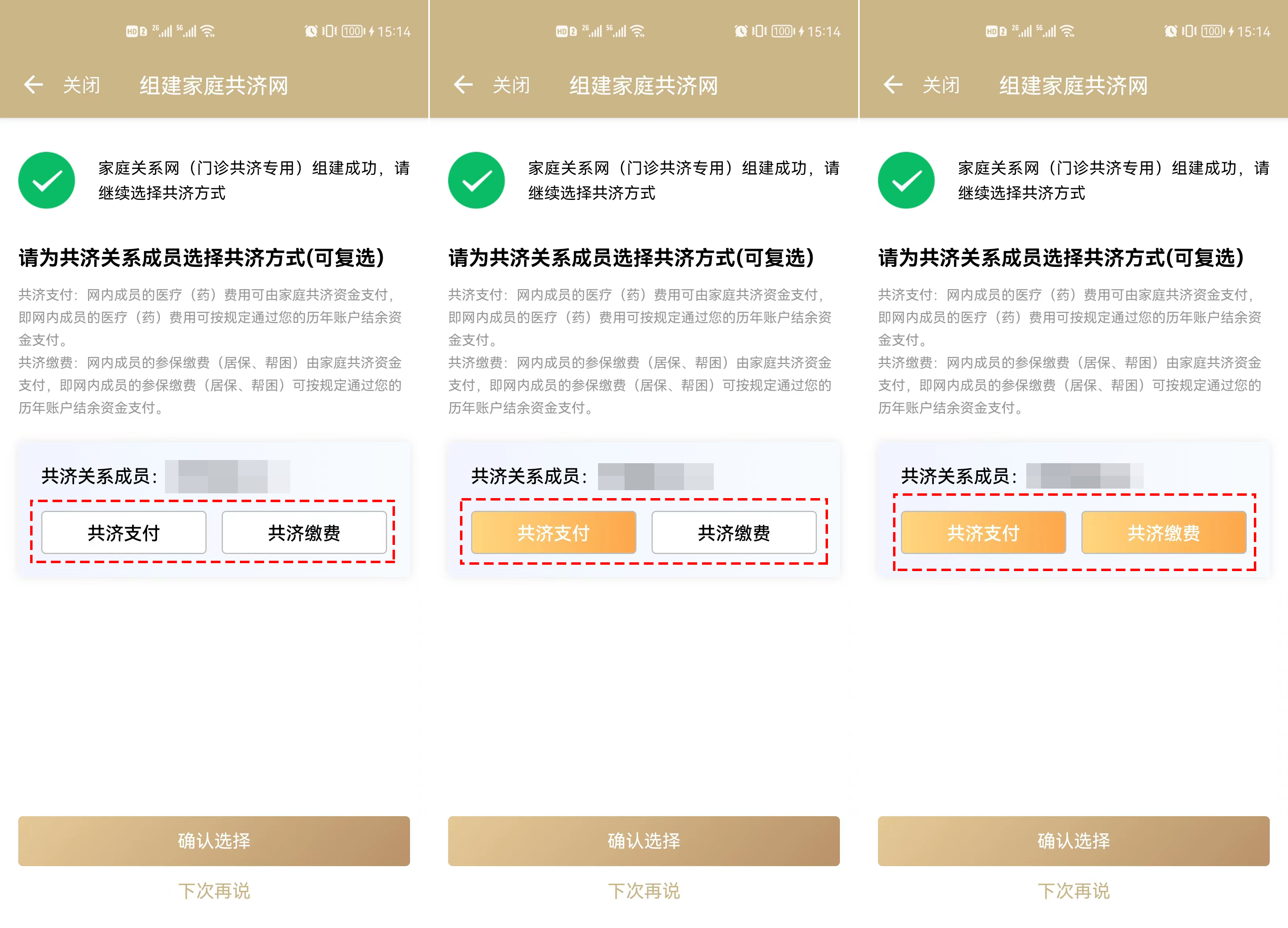 5、家庭共濟(jì)方式主要包括共濟(jì)支付、共濟(jì)繳費(fèi)兩種,可單選,也可復(fù)選;