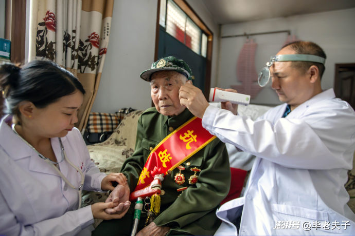 我林州的朋友郭勇峰出身中醫(yī)世家,是林州郭氏正骨第七代傳承人。上世紀(jì)六十年代,其曾祖父、祖父在修建紅旗渠施工工地為無數(shù)工友接骨療傷被稱為“神槍手”而聲譽(yù)大振。圖為7月27日上午,在97歲的抗戰(zhàn)老兵呂樓鎖家里,退伍軍人、中華源字號(hào)、省級(jí)非遺、骨傷科主治醫(yī)師郭勇峰(右)和臨床執(zhí)業(yè)醫(yī)師張林方正在給老人做健康檢查。通過額鏡檢查,發(fā)現(xiàn)老兵左耳鼓膜破裂。