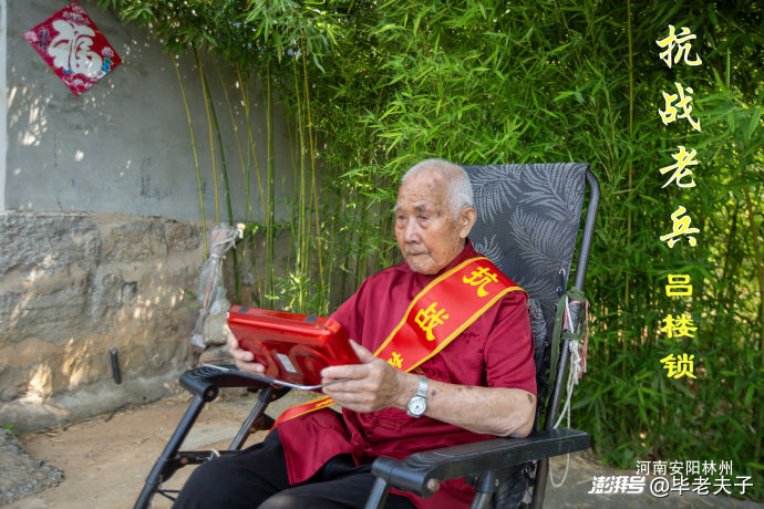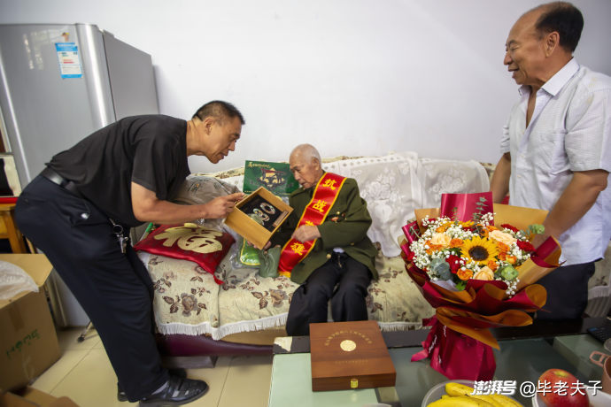 1949年10月全國(guó)解放,呂樓鎖因病返鄉(xiāng)務(wù)農(nóng),擔(dān)任村干部多年,是林州市目前唯一健在的退伍返鄉(xiāng)務(wù)農(nóng)的抗戰(zhàn)老兵。圖為8月31日,豫北團(tuán)隊(duì)志愿者畢興世正在給老人發(fā)放并展示龍?jiān)交饡?huì)專為抗戰(zhàn)老兵量身定制的“大禮包”。